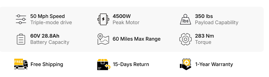 | 4,500W Mid Drive | 60V 28.8Ah | 60 miles | 50 mph | 124 lbs | 350 lbs | 14" , 12"x 3" |